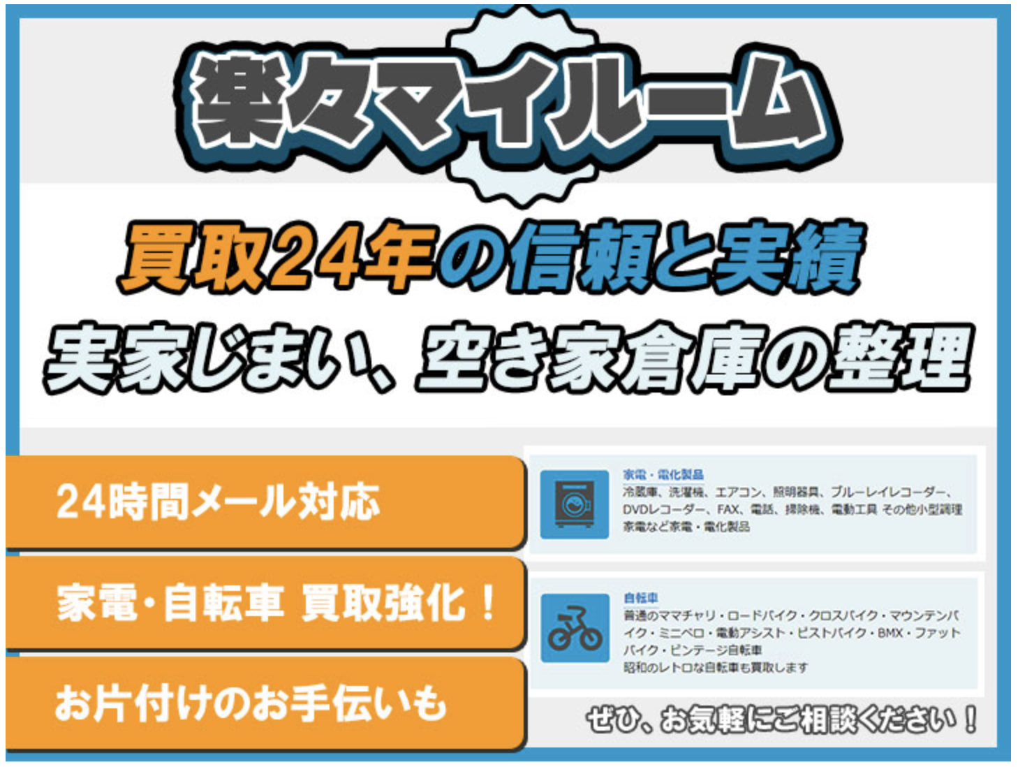名古屋のリサイクルショップ楽々マイルーム 名古屋の家電・カメラ・自転車・不用品の買い取り・信頼と実績のリサイクルショップです. 訪問買取いたします。多品目の買取実績. 買取24年の信頼と実績. 最近は実家じまい、空き家、倉庫整理のお手伝いが多くなりました。お気軽にお問い合わせください。