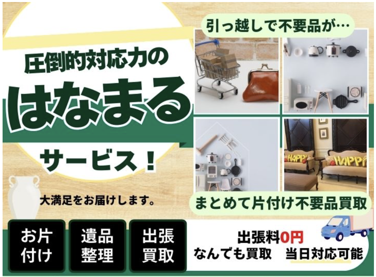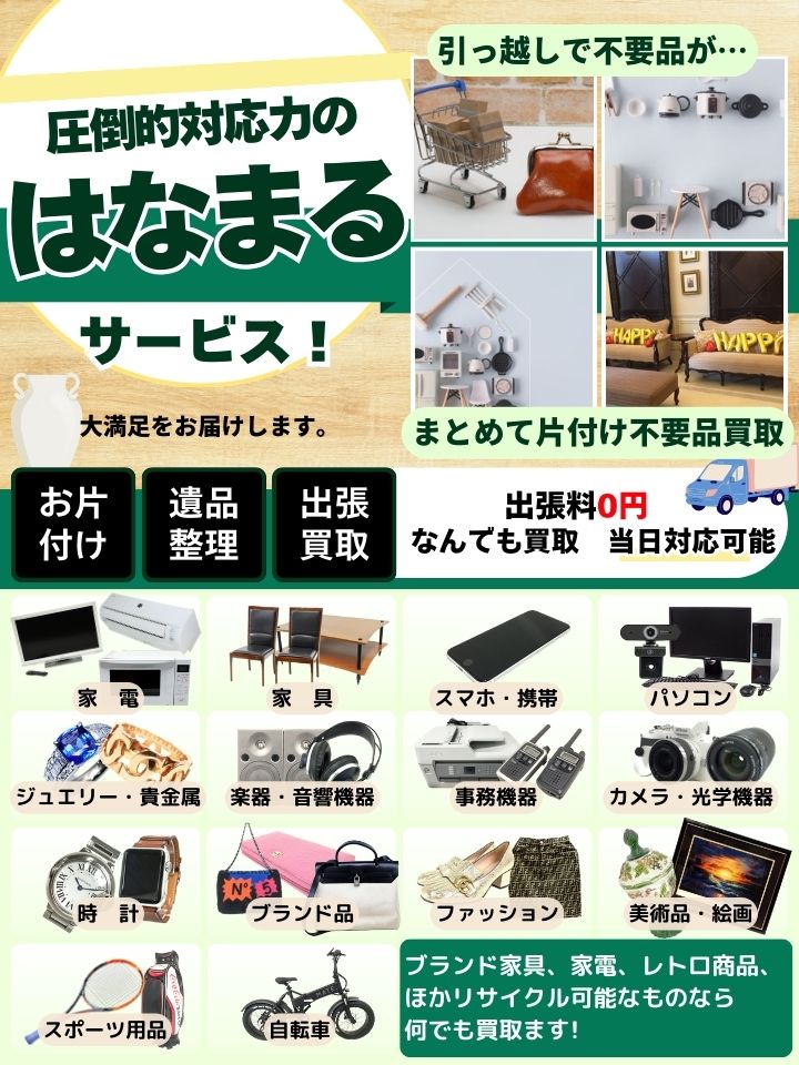 『出張買取はなまる』は千葉県の出張買取サービスです。「なんでも買取」をモットーに、貴重品から日用品まで幅広く対応。不用品回収も同時に承り、お客様の「困った」を一度に解決いたします。重い荷物の運び出しや片付けでお悩みの方、まずはお気軽にご相談ください。地域密着だからこその迅速対応で、お客様のお時間を大切にします。