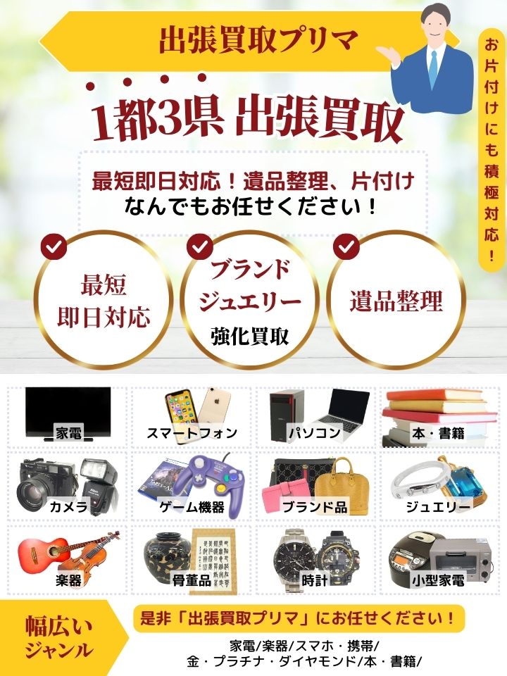最短即日対応、即日査定、即現金化! ・家具・家電・ブランド品・貴金属、ジュエリー・宝石などの買取なら 【出張買取のプリマ】へお任せください! 壊れている、使い古している、他店で買取不可能となってしまった商品も買取実績多数あり! 買取のことならお気軽に【出張買取のプリマ】へご相談ください!