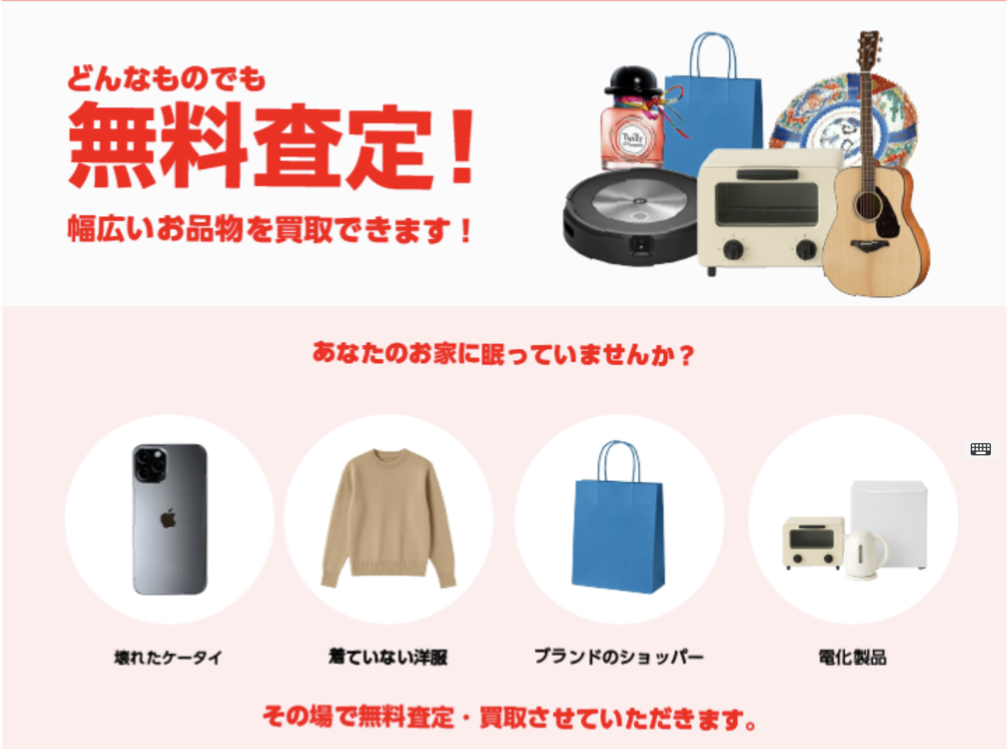 | 出張買取 | 電話・メールでお申込み頂いたお客様だけに査定のご予約を承っております。まずは、専用フリーダイヤルまでお電話ください。 |