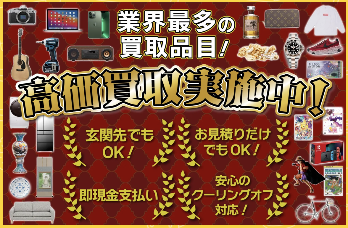 | 出張買取 | 出張費・査定費無料!空きがあれば最短当日でもお伺い可能です。1点~大量のお品物でもお任せください。また、不用品の回収も行っておりますので万が一、買取不可となってしまったお品物で処分にお困りの際はご相談ください。 |