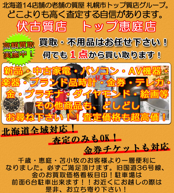 店舗買取 | 北海道で質屋とリサイクルショップ12店舗を運営するトップグループの恵庭店でございます。貴金属から金券カー用品 家電製品まで何でも扱っております。買えないものでも無料で引き取りができる場合がありますので お気軽にお申し付けください。 |