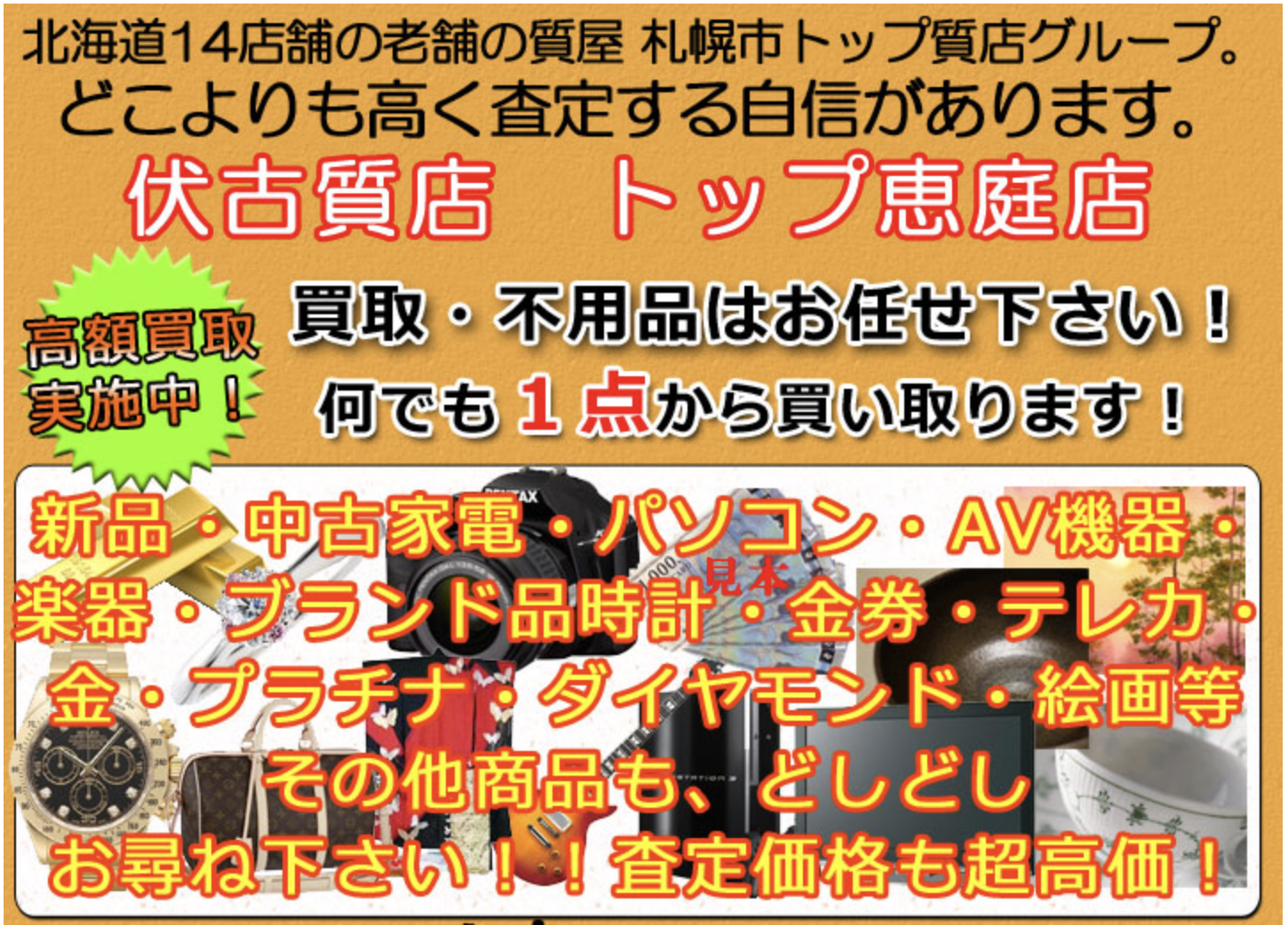 店舗買取 北海道で質屋とリサイクルショップ12店舗を運営するトップグループの恵庭店でございます。貴金属から金券カー用品 家電製品まで何でも扱っております。買えないものでも無料で引き取りができる場合がありますので お気軽にお申し付けください。