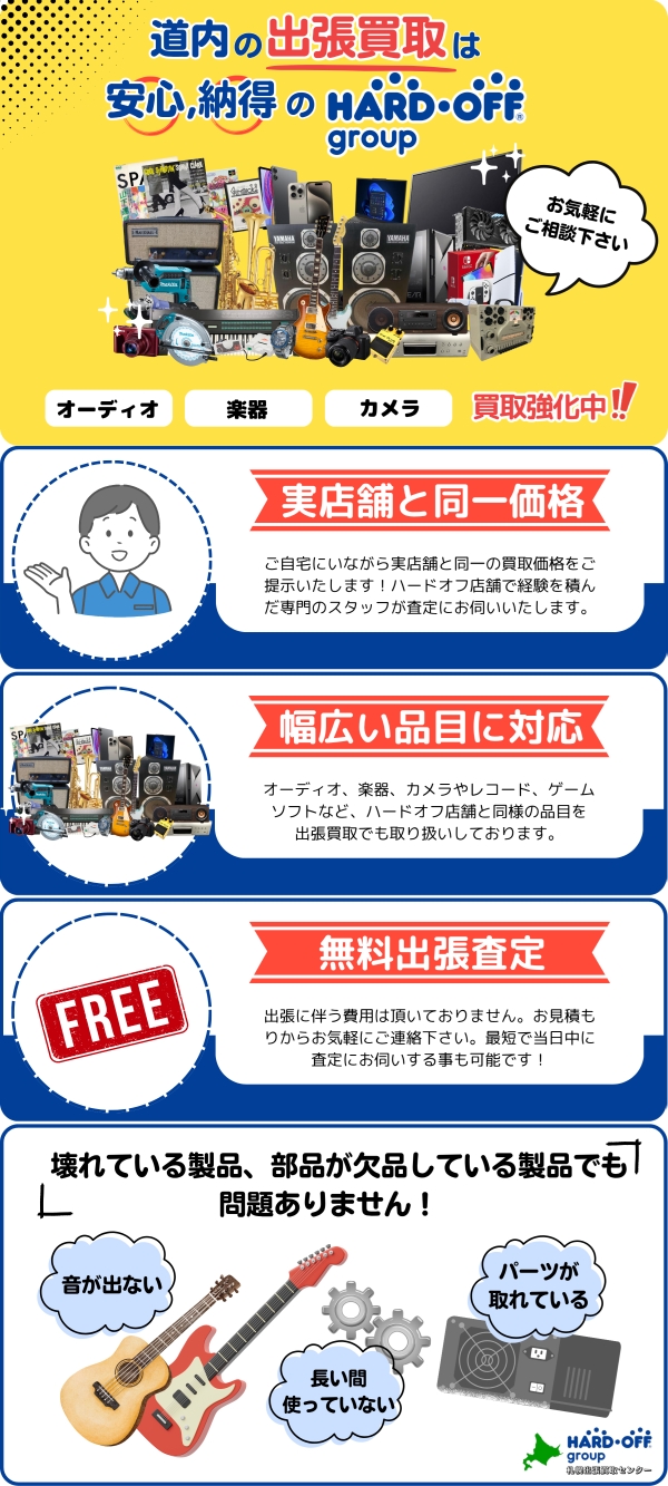 ハードオフグループ札幌出張買取センターでは、札幌市全域および近郊にお住まいの方を対象に、出張買取サービスを提供しています。ハードオフの実店舗と同じ幅広い品目に対応し、経験豊富な専門スタッフがご自宅までお伺いし、丁寧に査定いたします。大型スピーカーや大量のレコードなどもお任せください!安全な運び出しで安心のサービスをお届けします。まずはお気軽にご相談ください!