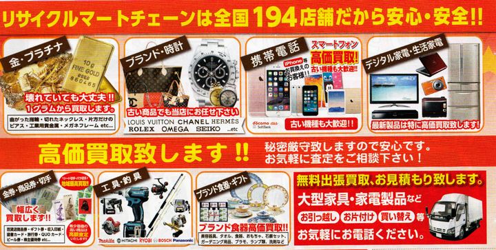 | 出張買取 | ご自宅に不用品ありませんか?お電話一本で、御自宅まで無料で査定にお伺い致します。お財布などのブランド品から家具・家電・生活雑貨などをその場で高値で買い取らせていただきます。引越しやリフォーム、大掃除で出た不用品は当店にお任せください! |