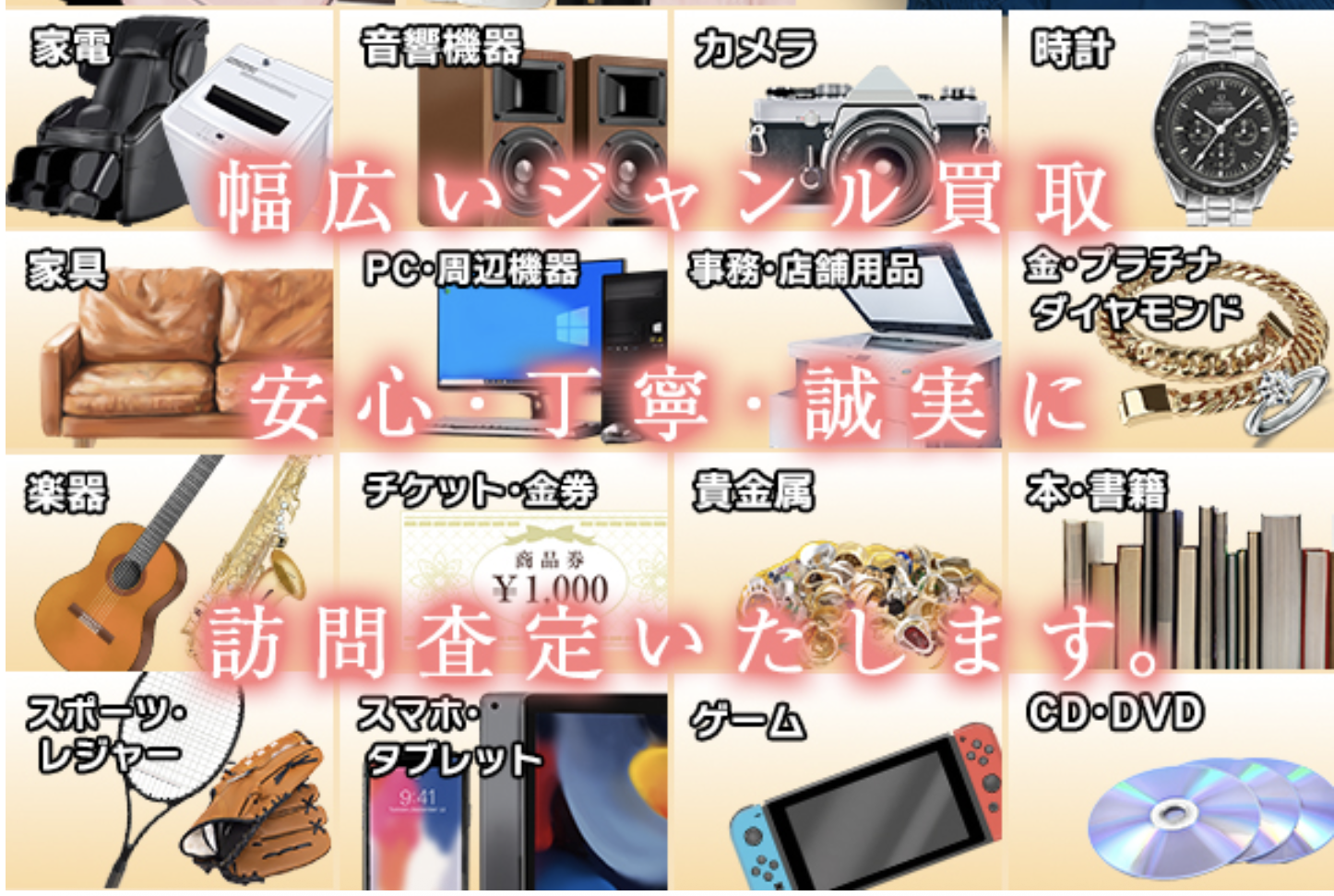 お大事にされていたモノや思い入れのあるモノをお客様から買い取りさせていただくお仕事ですので、最大限の対価・最高のサービスさせていただくよう努めております。 また、 ①1点1点プロの認定査定士が間違いのない査定が可能 ②遺品、生前整理当日見積り可能 ③当日訪問可能 ④引越ゴミ、不要品、買取れる商品はその場で現金買取 ⑤様々な商品を高額買取可能