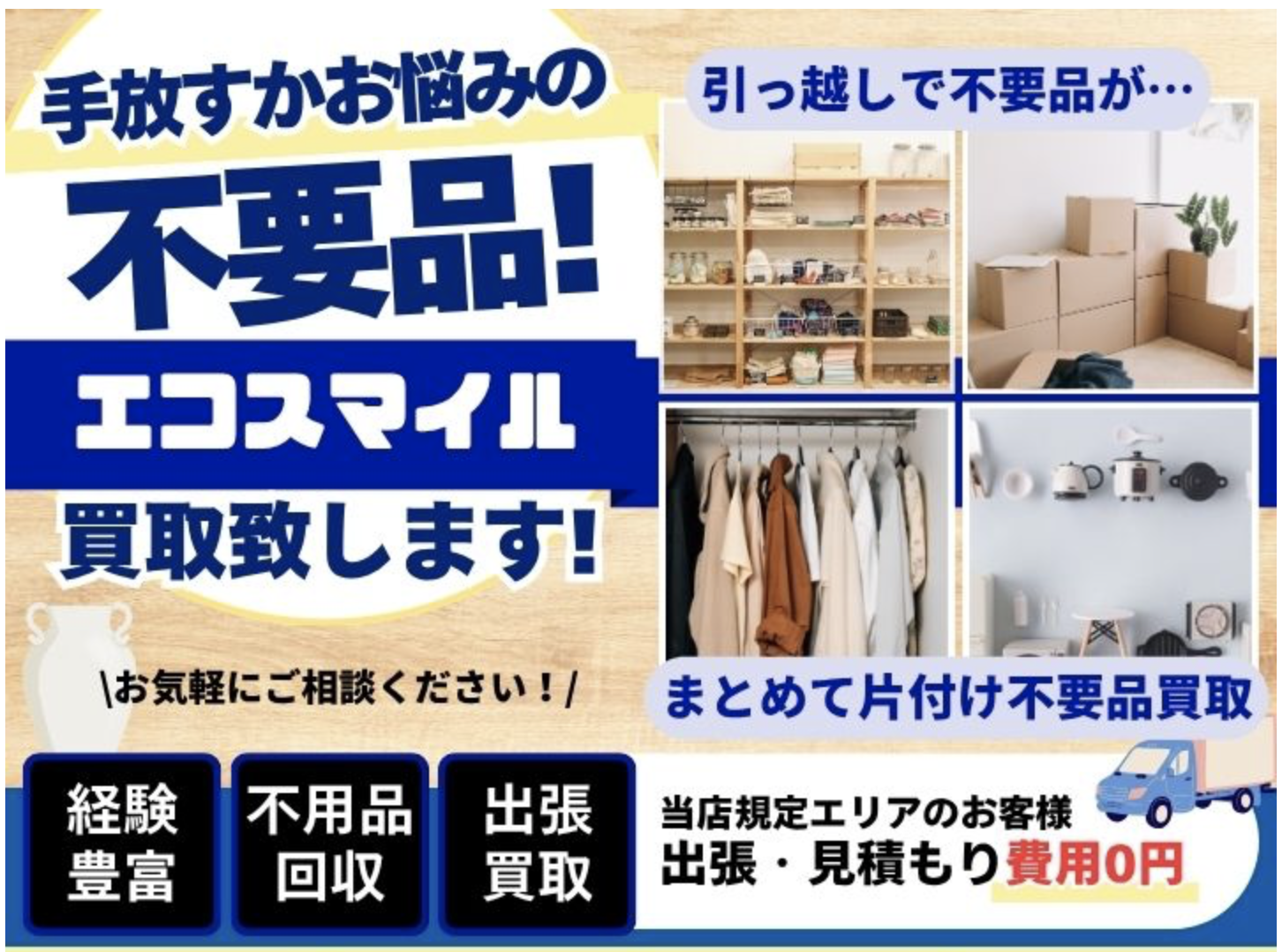 査定当日に即現金買取!どんなものでも無料査定します!料金にご納得いただけない場合はキャンセルOK!まずはお気軽にお問い合わせください! 当日対応可能!お急ぎの場合もエコスマイルなら安心! |