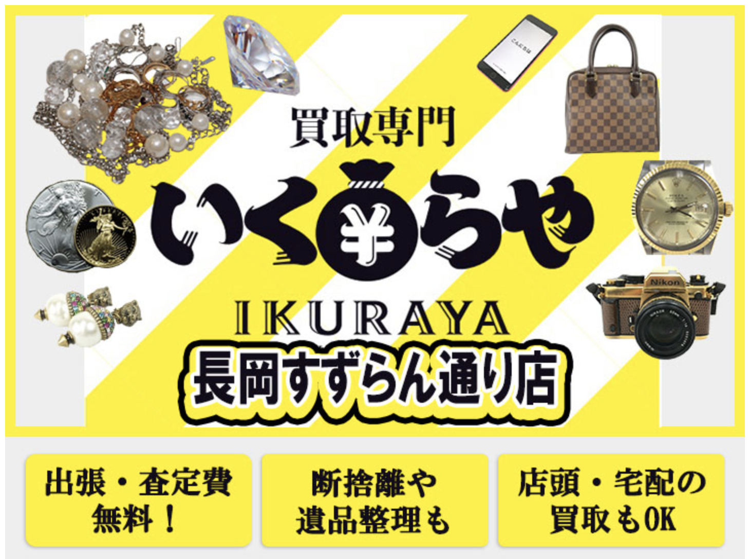 | 店舗買取 | 査定無料! 高額査定を実現!! 長岡駅前店舗だから安心!! 生前整理・遺品整理のお手伝いさせてください♪不要になったものや使わなくなってしまったもの、「これいくらになるのかな?」といった価値が分からないもの等、誠心誠意 丁寧に査定させていただきます。 気になるものや迷われているもの、価値がわからないものがあれば、ぜひ高価買取、査定無料の買取専門いくらや 長岡すずらん通り店にお任せください。 出張査定も無料です。 |