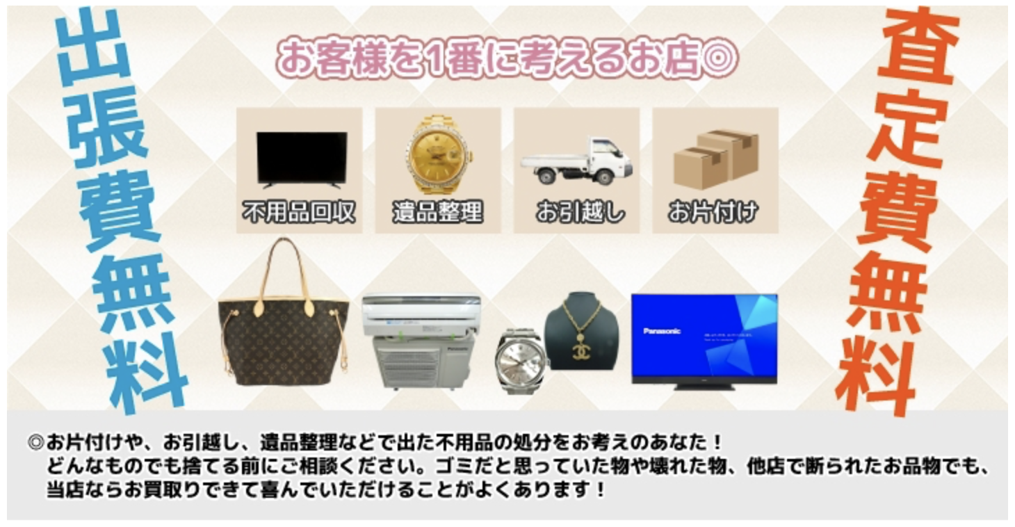 | 出張買取 | 出張費、査定費もちろん無料◎1点からでもお値段頑張らさせていただくのですが、複数お買取りさせていただけると、お値段いっぱいいっぱいまで頑張れますので、いろいろお値段聞いてみていただけますと幸いです◎ |