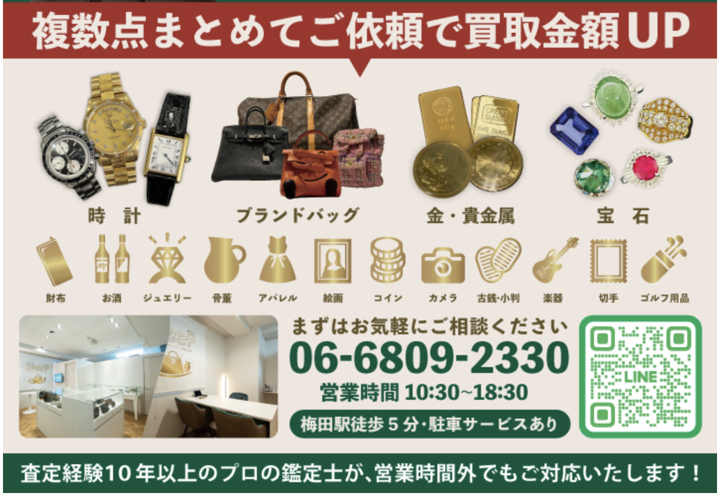 【買取店「SleeP(スリープ)」大阪梅田店】 査定鑑定歴10年以上の経験より高価買取いたします。 大阪駅・梅田駅の各線より徒歩5分、ホワイティうめだ 泉の広場 M10出口から直ぐに実店舗がございます。 ブランド品(バッグ・ヴィンテージ・時計・アクセサリー)金 プラチナ・ ジュエリー・色石・ダイヤモンド・貴金属・骨董品・家具など、幅広いジャンルを無料で査定、お買取させていただいております。