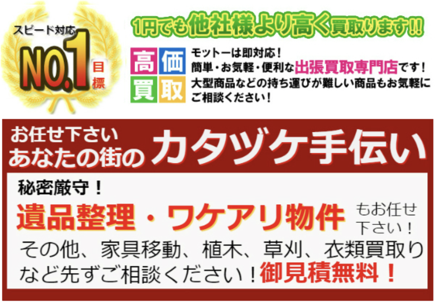 1点の買取からご家庭・店舗・オフィスなどの、商品買取り〜片付けまで総合的に対応可能です。 初めてのお客様から女性のお客様でも安心してご利用頂けるよう当店のプロがお客様の前でしっかり査定いたします! お気軽にお問合せください。 引越から片付け、不要品処分まで一貫して行います。引越業者に依頼するより引越代節約になります。