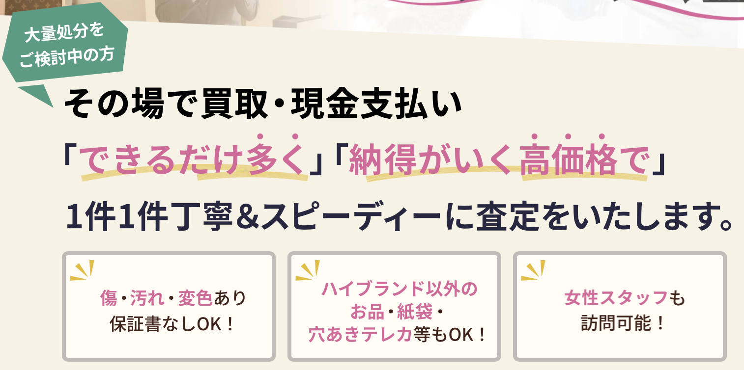 その場で買取・現金支払いOK! 着物やかばん、アクセサリーの出張買取・遺品整理なら「ハナハナ鑑定」。他社で値段がつかない品も買い取ってくれた!」とのお客様の声を多くいただけます。女性鑑定し指名もできるので、化粧品なども得意です。