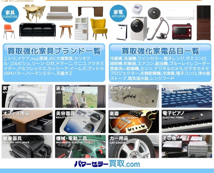 家具、家電、オーディオ、楽器、オフィス用品、工具、介護、美容・健康用品、治療器、無線機、カー用品、教材など幅広いジャンルの中古品を取り扱っています。 ジャンルがみあたらない商品でも買取可能な場合もございます。 お客様にとってのご不用品、どの業者様より高価買取いたします!ご不明点などございましたら今すぐご相談を!