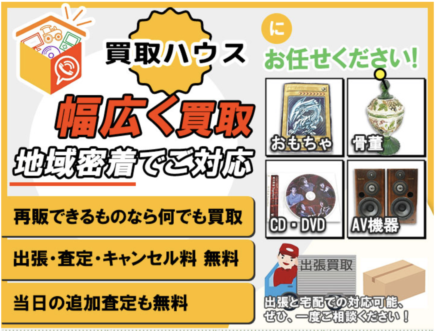 埼玉県北部を中心に幅広いジャンルの買取・販売を行っています!地域に密着して多くの信用・信頼・実績を重ねてきました! 「こんなものでも大丈夫?」というものもお声がけください! 完全無料にてお伺いし、お値段がつくものはしっかりと買い取らせていただきます! 気軽で呼びやすいからこそリピーターの方も多いのが特徴です! 是非一度お問合せくださいませ!