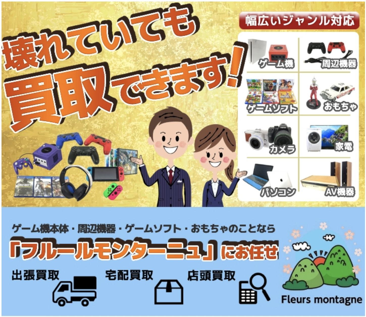 ゲームに特化した買取りを行っております。 ゲーム機本体やゲームソフト、コミック本、遊ばなくなったおもちゃなど主にを買取しています。 宅配、出張の買取に対応しており、全て無料になります。 本体やソフトに不具合があるもの、最新の物だけでなく発売当時は数百円、数千円程度のレトロな玩具などでも、お気軽に一度お問い合わせください。