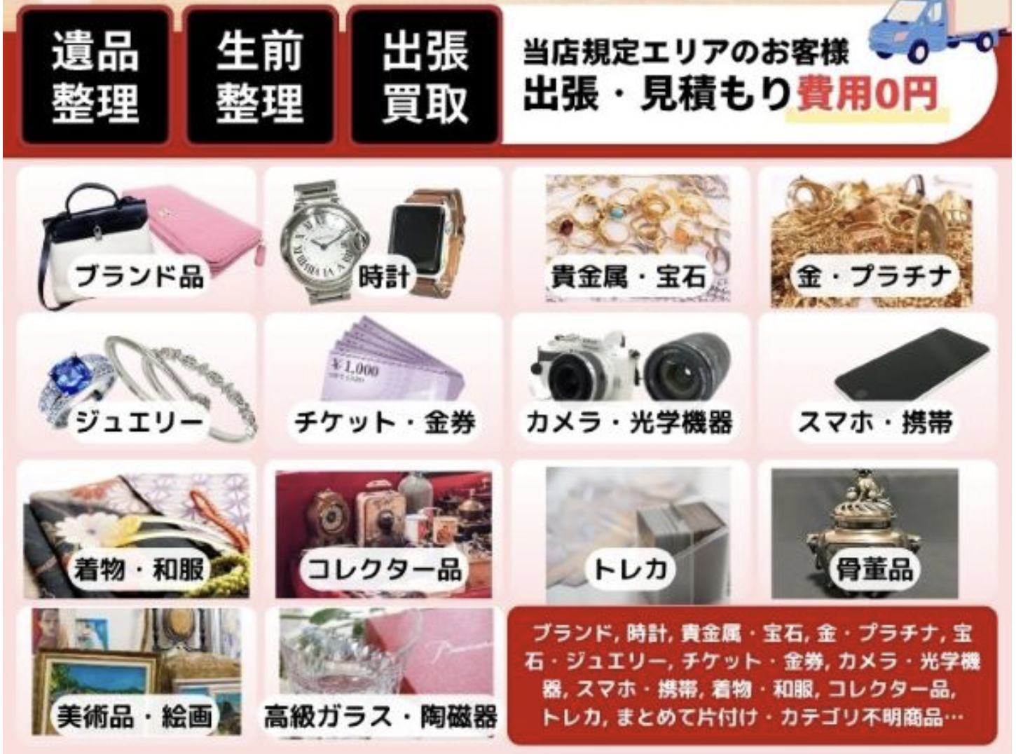 | 出張買取 | 出張料・査定料はすべて無料!お電話一本で経験豊富な鑑定士がご自宅までお伺いし、その場で丁寧に査定・現金買取いたします。貴金属・ブランド品・時計・古銭・骨董品など幅広く対応可能です。初めての方でも安心の説明とスピーディーな対応を心がけております。 |
