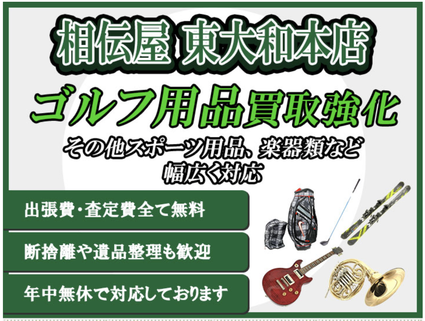 不要となっているゴルフ用品、楽器、ゲーム、カメラ、ホビー類など趣味やコレクター性の高い商品の買取が得意です! 引き取りや片付けも対応しておりますので是非一度お試しください!