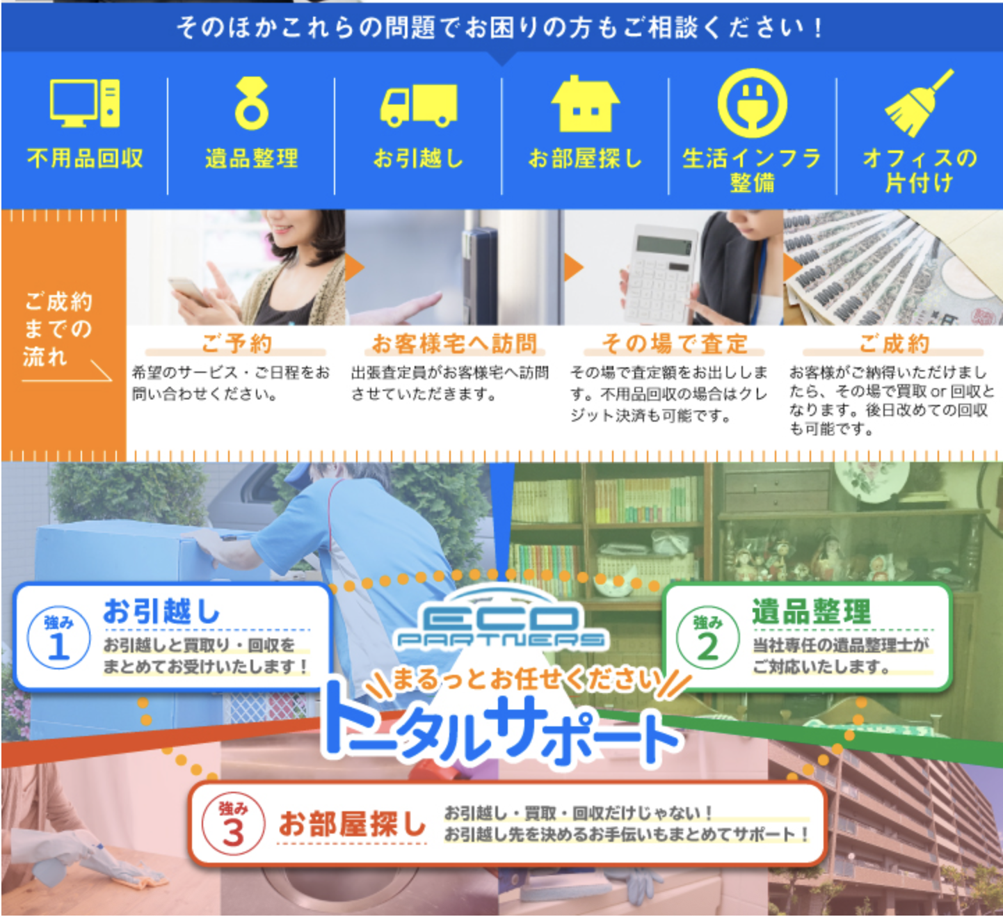 当社は業界随一の 『高価買取』『格安処分』で高評価を頂いております。 お値段だけではなくプロのスタッフによる行き届いたサービスをご提供させて頂いております。 エコパートナーズでは【業界最高水準の高価買取】と【お客様の個人情報が万全に保護された不用品回収】の2つのサービスに自信を持っております。