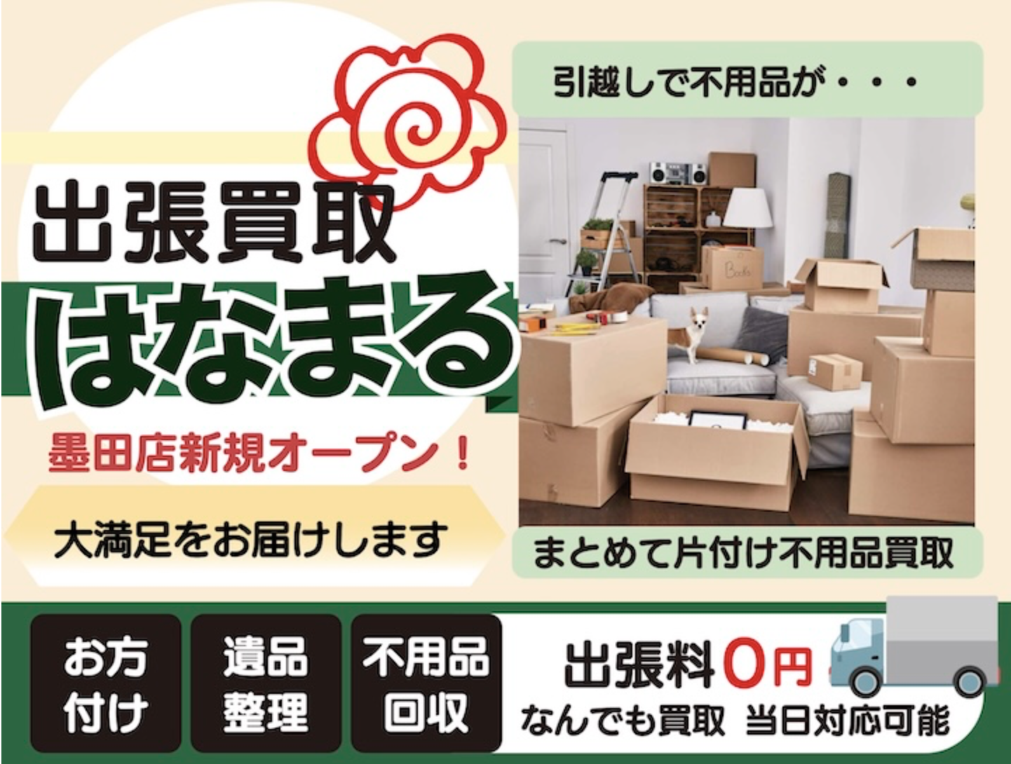 多くのお客様から高いご評価をいただき、『出張買取はなまる』は東京都墨田区に新たに出張買取サービスの拠点を設けました。 「なんでも買取」をモットーに、貴重品から日用品まで幅広く対応。不用品回収も同時に承り、お客様の「困った」を一度に解決いたします。 重い荷物の運び出しや片付けでお悩みの方、まずはお気軽にご相談ください。 地域密着だからこその迅速対応で、お客様のお時間を大切にします。