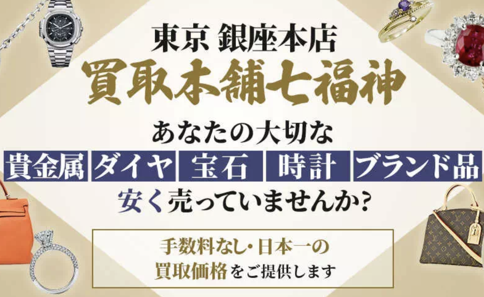 銀座の高価買取は査定料・手数料無料の七福神へ!常に相場限界価格にてお買取。土日祝日も休まず営業中!銀座駅から2分、東銀座駅、JR有楽町駅から3分、銀座一丁目駅から1分のアクセス!