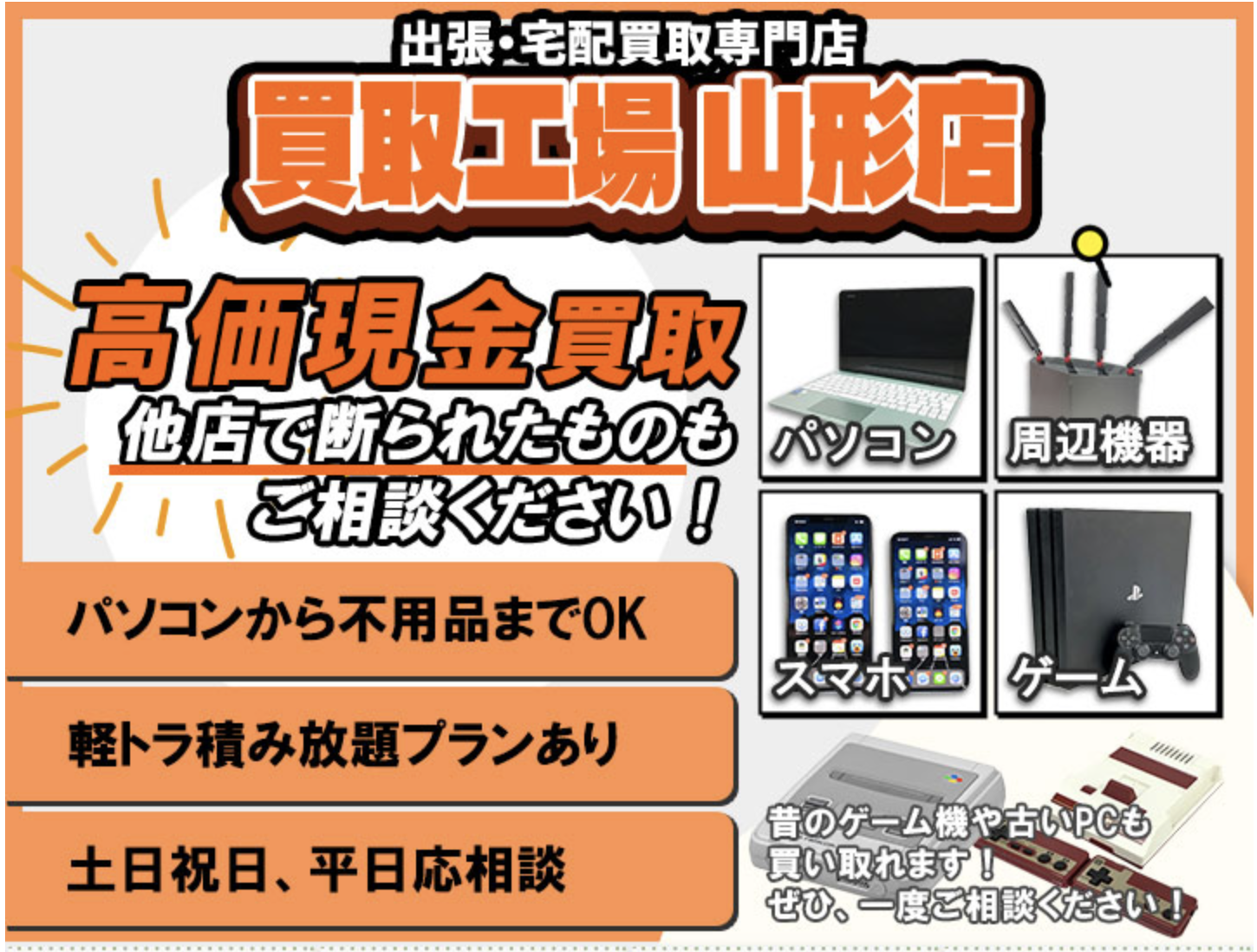 | 出張買取 | ・即日現金でお支払い、出張買取(土日祝日対応) 平日対応応相談・山形県南部エリア出張料金無料・仙台、福島方面 当店指定日は出張料金無料・買取総額30,000円以上で出張料金無料・まとめてご依頼で出張料無料・その他 季節限定で無料プラン有り・不用品回収は 軽トラ積み放題プラン(16,500円)できれいに片付きます |